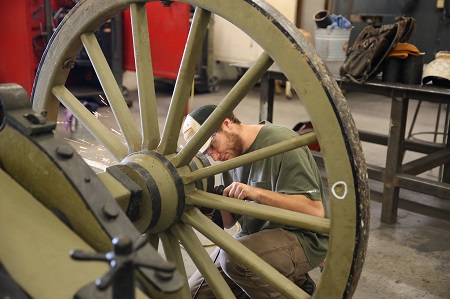 EMCC students welded a spot on one wagon wheel where water had penetrated a joint, replaced square nuts on the wheels and fabricated a missing thumb screw before buffing the whole carriage down to ready it for paint.